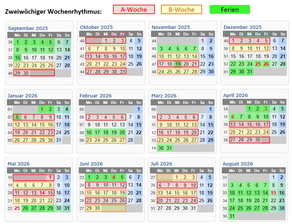 Nachmittagsunterricht (betrifft nur Pflichtunterricht) in den A-Wochen jeweils mittwochs