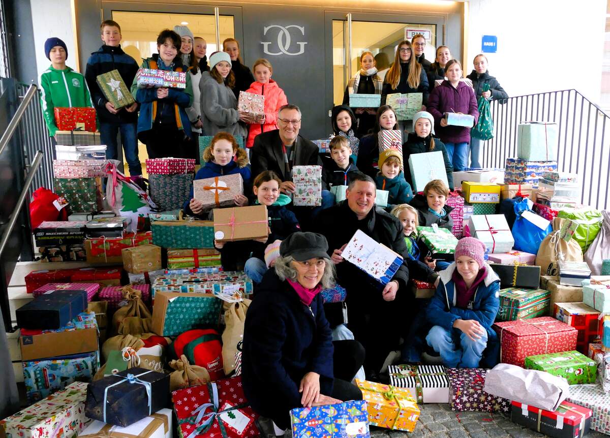 140 Weihnachtspäckchen – von der Schulfamilie des Gabrieli-Gymnasiums liebevoll zusammengestellt und verpackt - übergaben Schulleiter Christof Neumayr, Religionslehrerin Maria Frey und Schülerinnen und Schüler der 5. und 8. Jahrgangsstufe stellvertretend für die ganze Schule an Pfarrer Vasyl Shafram, außerordentlicher Bischofssekretär der Erzdiözese Ternopil-Zboriv. Erfreulicherweise konnte erstmalig auch die Internatsgemeinschaft des GG zwei große Pakete beisteuern.