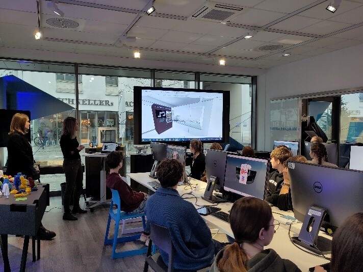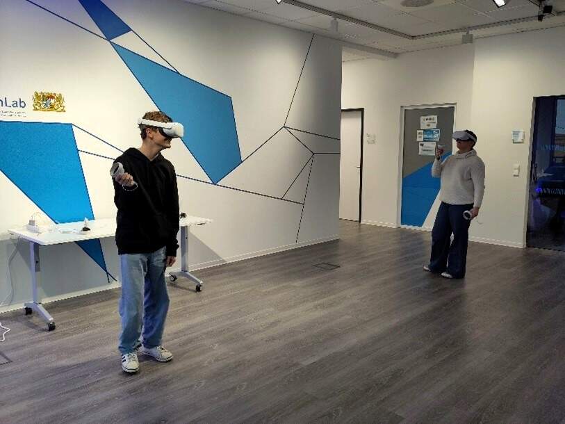 Am 24.1.2024 und an zwei weiteren Terminen hatten die 10. Klassen des Gabrieli-Gymnasiums die Chance, im BayernLab Eichstätt in eine solche Welt einzutauchen. Das BayernLab ist ein Innovationszentrum, das den zukünftigen digitalen Wandel unterstützen und Technologie der Zukunft erlebbar machen möchte. Die Kooperation mit mehreren Partnern [Vertreter des Projekts „Mensch in Bewegung“, Journalismus-Studierende und das Zentrum für Lehrerinnen- und Lehrerbildung der KU Eichstätt (ZLB)] ermöglichte es den Schülerinnen und Schülern, sich mit Hilfe von VR-Brillen in eine virtuelle Welt zum Thema künstliche Intelligenz (KI) zu versetzen. Im VR-Raum konnten sie sich frei bewegen und hatten die Möglichkeit, verschiedene Szenarien zu erkunden und sich so über KI in sozialen Medien und im Alltagsleben zu informieren, etwa über Deepfakes, virtuelle Influencer oder die Einsatzmöglichkeiten und Grenzen von ChatBots. So gewannen sie einen lehrreichen Einblick in diese sich rasant entwickelnde Technologie.