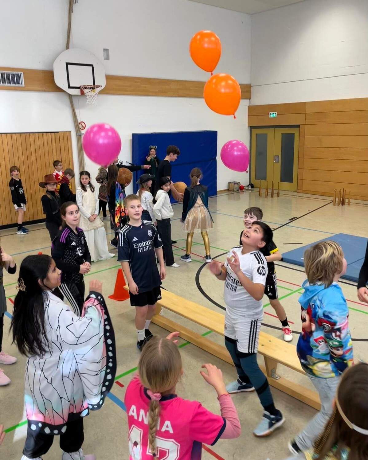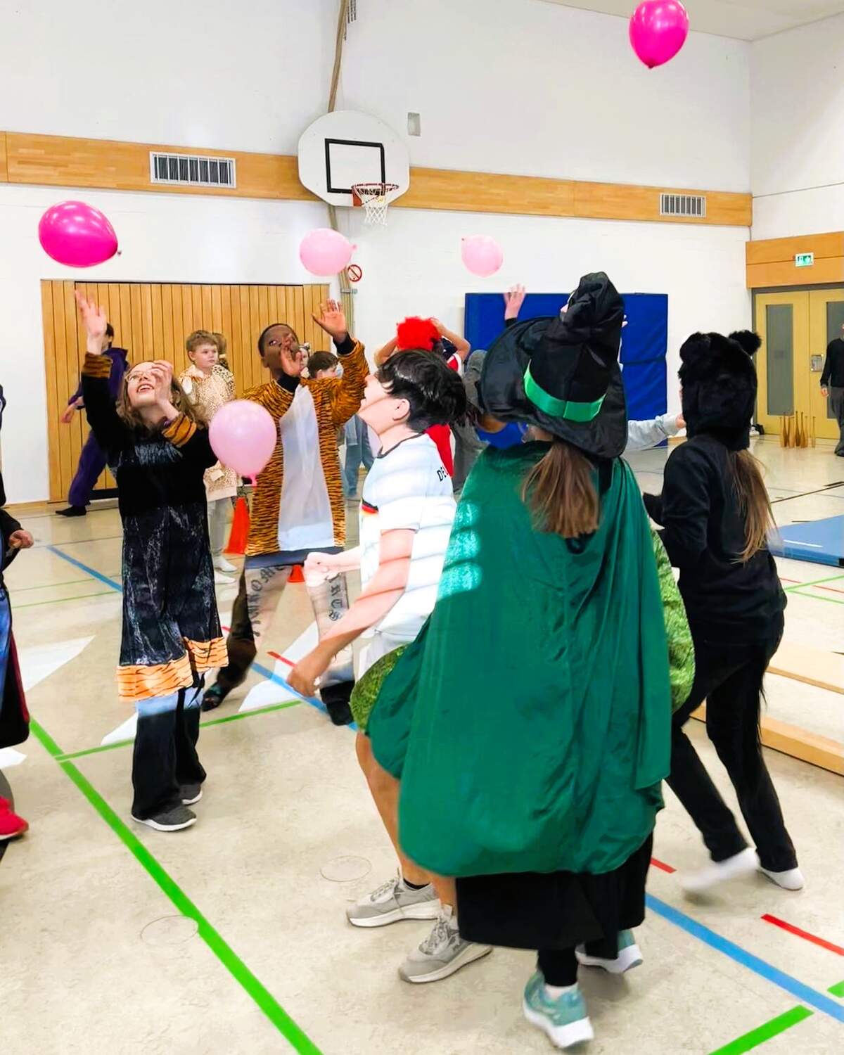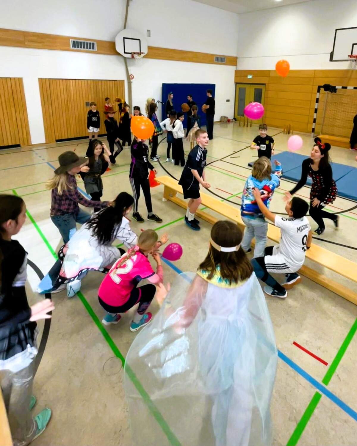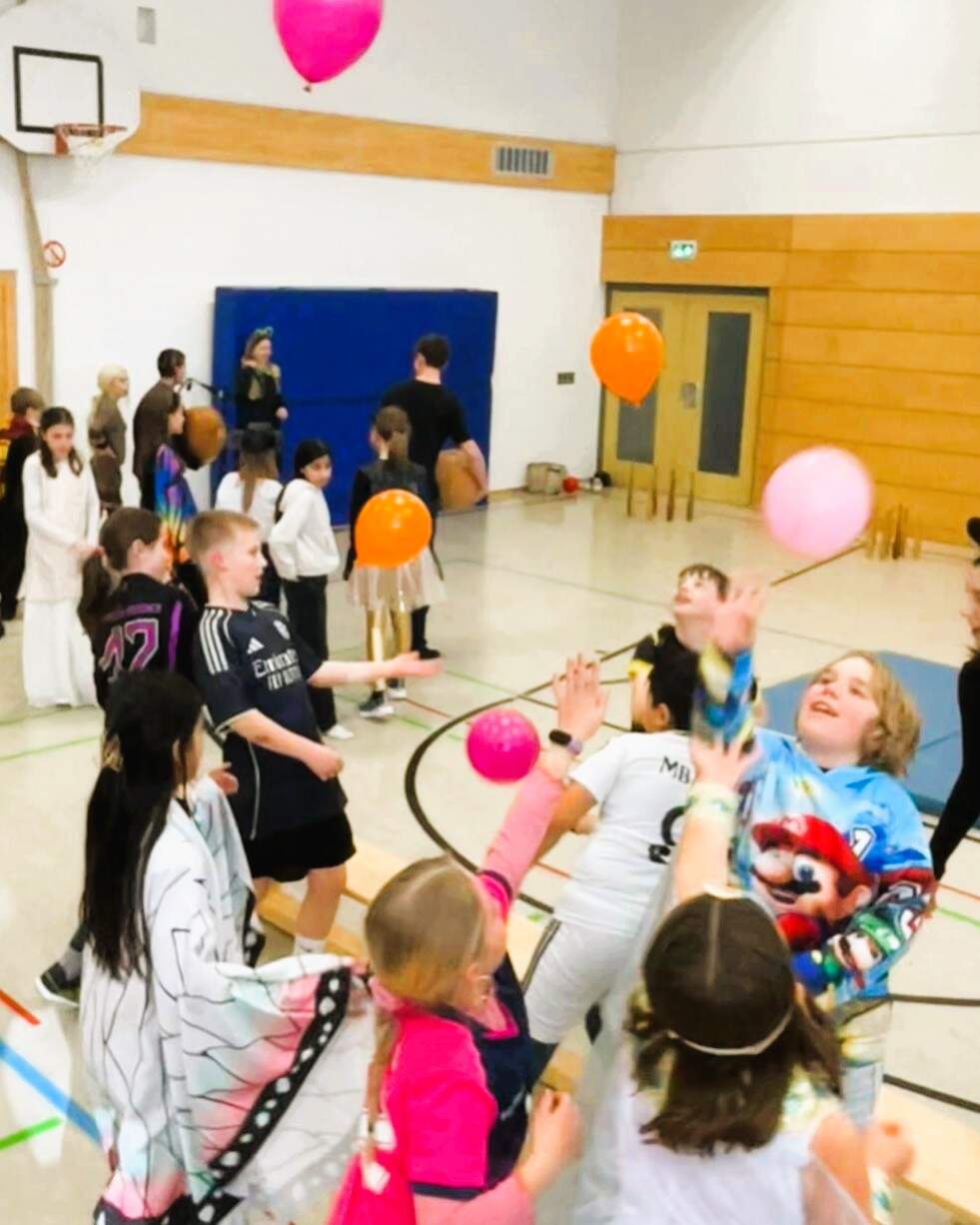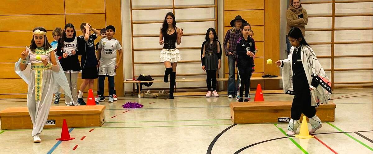 Die diesjährige Faschingsfeier der Klassen 5a, 5d und 5e des Gabrieli-Gymnasiums mit ihren Tutoren war sehr lustig, da diese Stationen in der Turnhalle aufgebaut hatten, an denen die einzelnen Kinderteams Punkte erringen konnten, so z. B. ein Eierlauf über einen Parcours mit Tennisbällen auf Löffeln, eine Station mit Luftballons, die nicht zu Boden fallen durften und die man über eine Strecke zu zweit zwischen den Schultern transportieren musste, ohne, dass sie herunterfielen, ein imaginäres Eisschollenfeld mit Hula Hoop-Reifen, durch das sich das Team den richtigen Weg bahnen musste, eine Kegelbahn mit Medizinbällen und Wissensquizspiele im Stil von 1, 2 oder 3. Auch Faschingslieder wurden gespielt. Die Kinder der 5a, 5d, 5e und die Tutoren hatten viel Spaß!