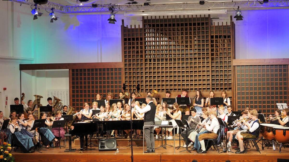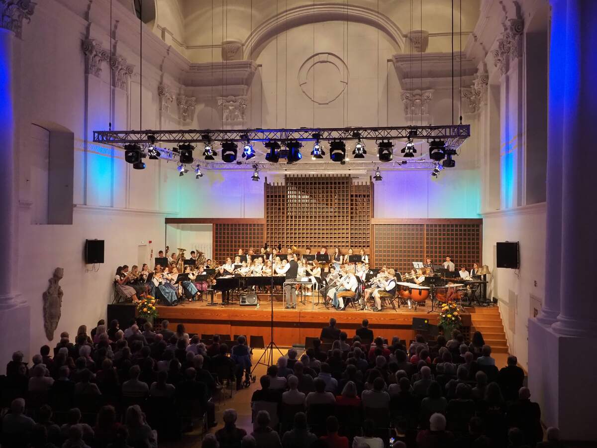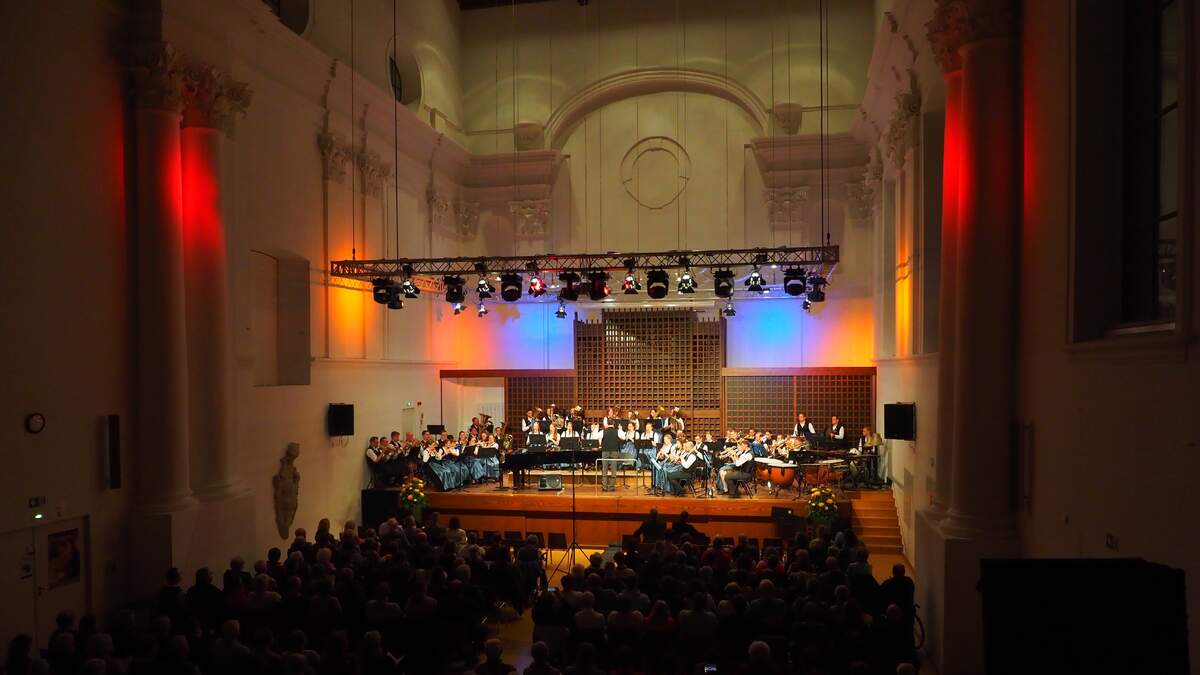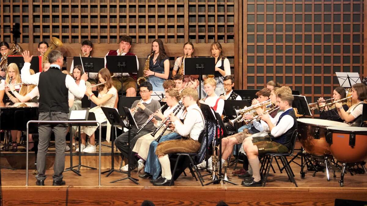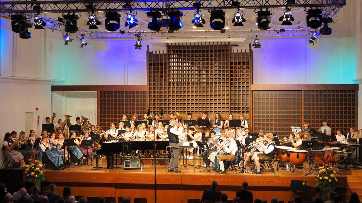Das Sinfonische Blasorchester auf seiner heimischen Bühne in der Aula des Gabrieli-Gymnasiums: