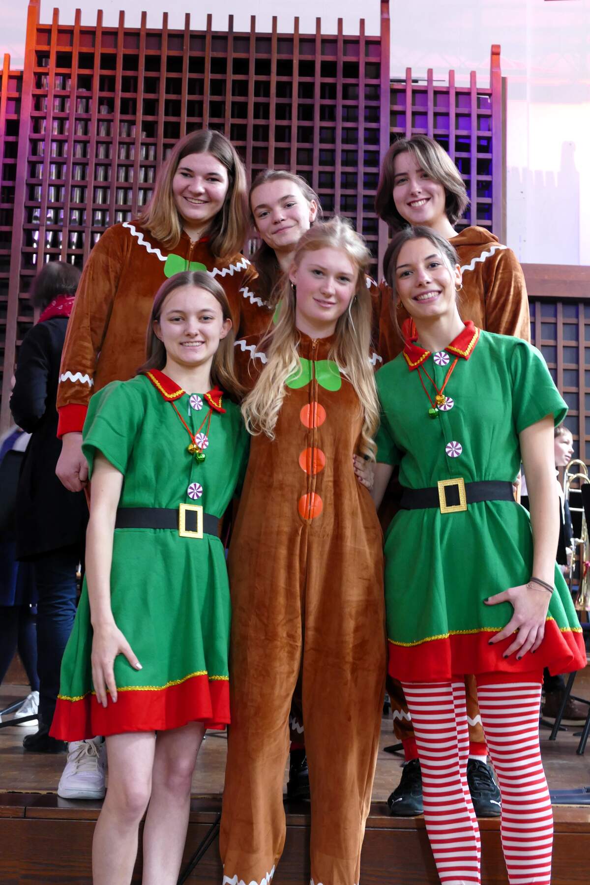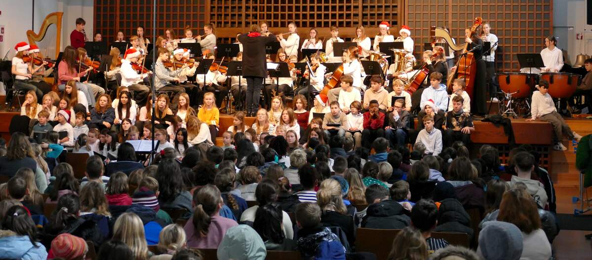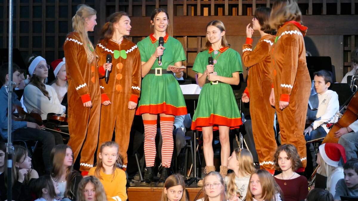 Nachdem die Jugendensembles ihr Können zum Besten gegeben hatten, konnten die jungen Besucherinnen und Besucher zur Musik unseres Jugendorchesters zusammen mit Schülerinnen und Schülern der 5. - 8. Jahrgangsstufe und den Weihnachtselfen und Lebkuchen-Mädchen der 11. Klasse singen und tanzen – Musik zum Mitmachen in der Aula des GG!