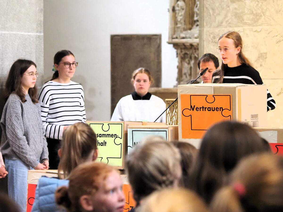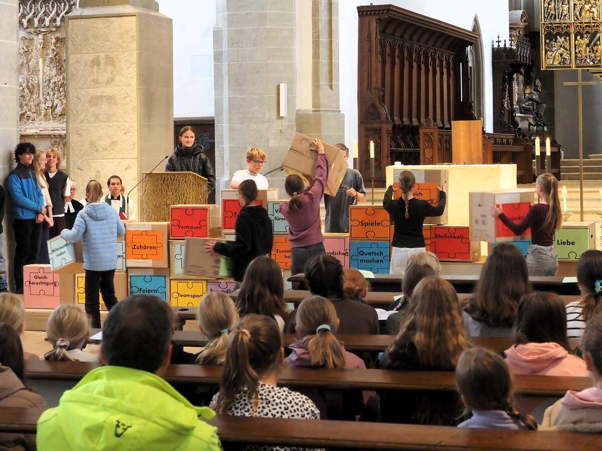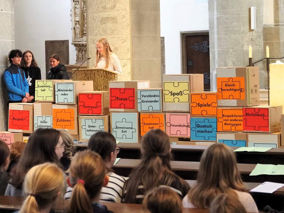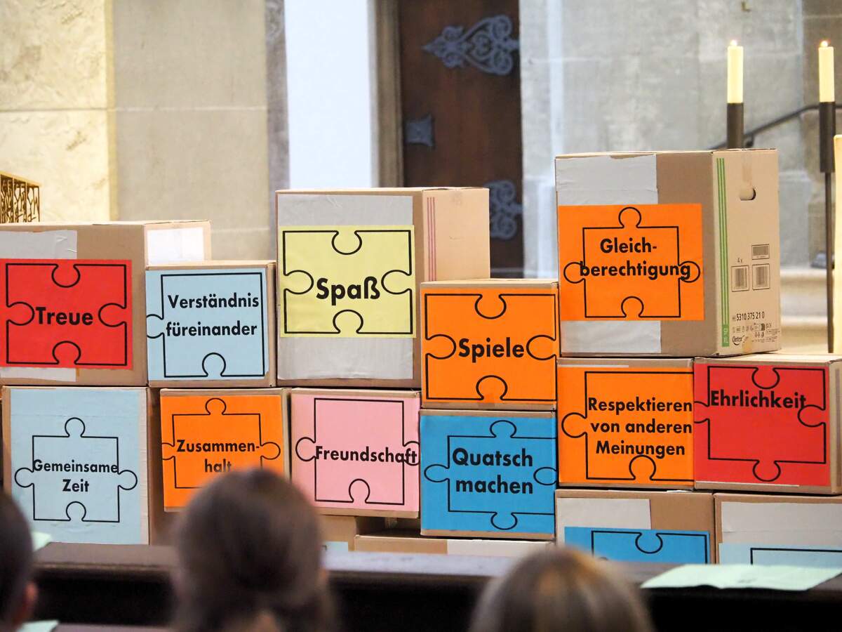 Konkrete Werte und gute Charaktereigenschaften - z. B. "Gemeinschaft", "Rücksichtnahme", "Zusammenhalt", aber auch "Spaß" und gemeinsame "Spiele" - wurden als einzelne "Puzzleteile" von den Schülerinnen und Schüler formuliert und bei ihrer Gestaltung des Gottesdienstes vor dem Altar als "feste Mauer" aufgebaut.
