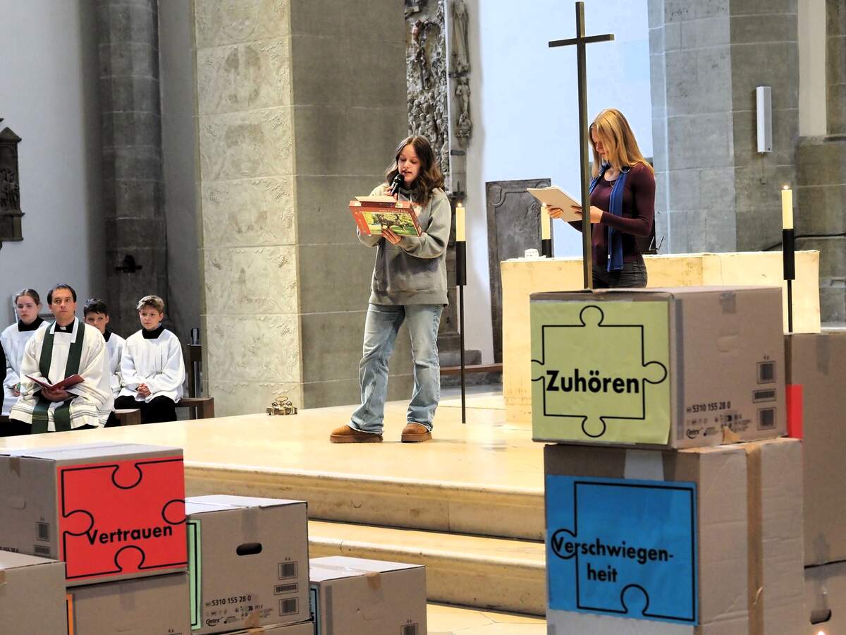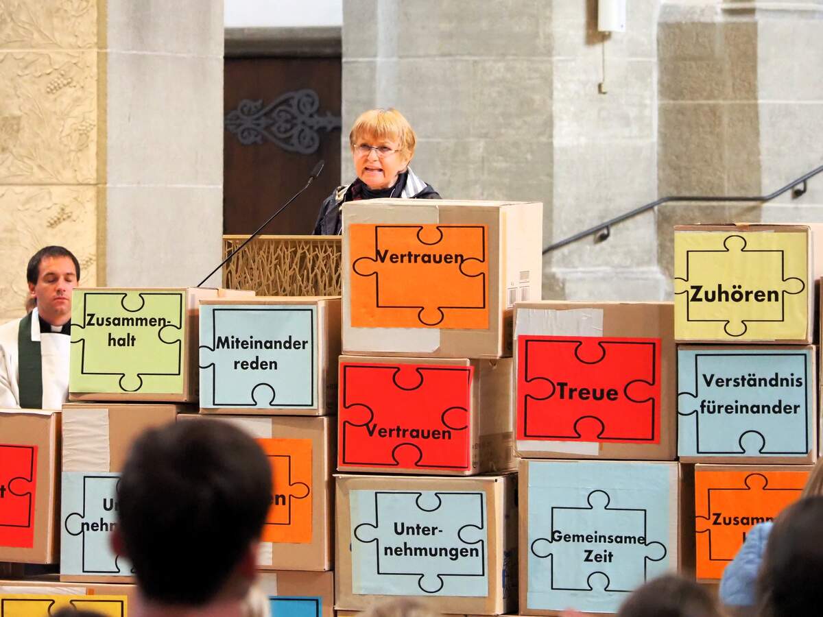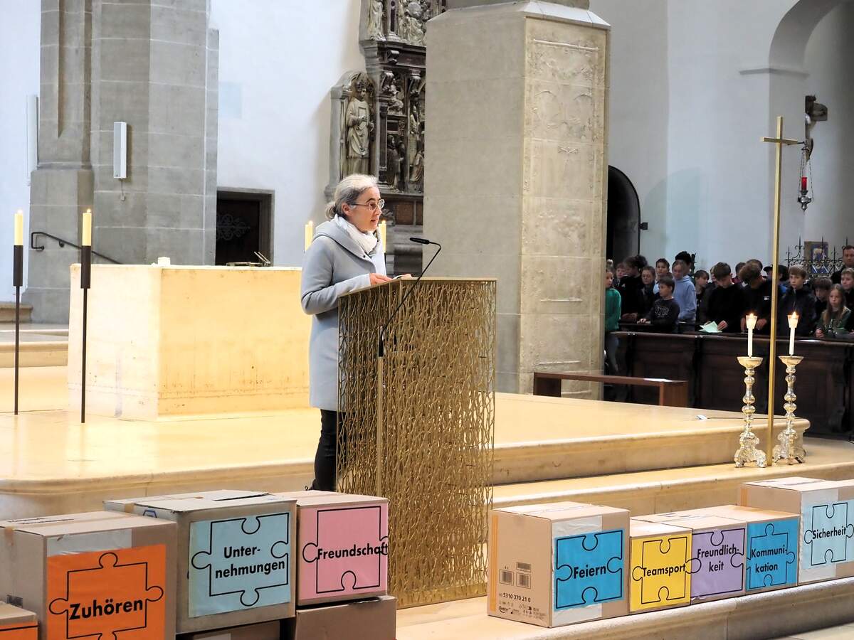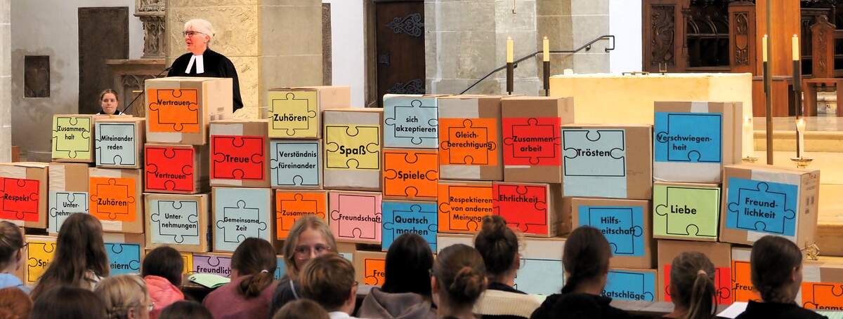 Konkrete Werte und gute Charaktereigenschaften - z. B. "Gemeinschaft", "Rücksichtnahme", "Zusammenhalt", aber auch "Spaß" und gemeinsame "Spiele" - wurden als einzelne "Puzzleteile" von den Schülerinnen und Schüler formuliert und bei ihrer Gestaltung des Gottesdienstes vor dem Altar als "feste Mauer" aufgebaut.