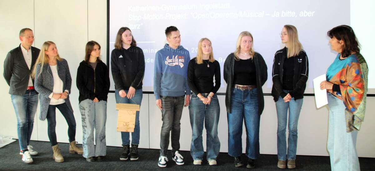 Sechs von elf Schülern konnten bei der feierlichen Preisverleihung dabei sein und erhielten, ebenso wie die mitfahrenden Lehrkräfte StRin Johanna Gabler (Projektleitung) und StD Manfred Roppelt (Vertretung der Schulleitung), aus der Hand der Ministerialbeauftragen Frau OStDin Brigitte Grams-Loibl ihre Urkunden.