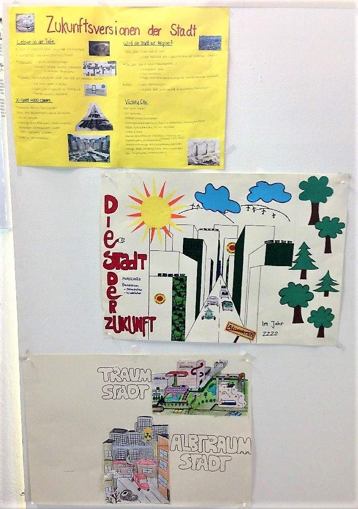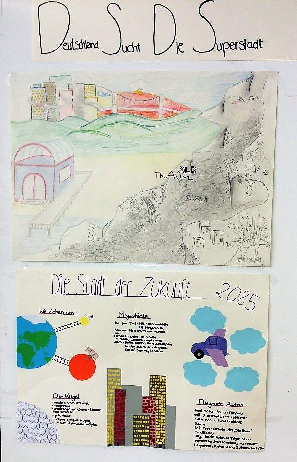 Auch wenn sich Traum und Albtraum nur durch drei kleine Buchstaben unterscheiden, so steckt doch mehr dahinter. Wir haben uns Gedanken zu diesem Thema gemacht und versucht, dies anhand eines Plakates anschaulich zu machen. Gegenübergestellt sind zu sehen zwei Städte oder zumindest Teilausschnitte zweier Städte. Während eine von beiden eine Traumstadt darstellt – es ist viel Grün vorhanden, die Stadt wirkt modern und recht sauber, bekommt man auf dem zweiten Bild das Gegenteil von der Idylle zu sehen. Müll, triste Farben und Radioaktivität sind nur ein kleiner Teil von dem, wie man sich eine Albtraumstadt vorstellen kann. In beide Richtungen, Traum und Albtraum, ist reichlich Platz für Interpretation. Es bleibt also nur zu hoffen, dass den Menschen die Augen geöffnet werden und sie anfangen unsere Welt in das Idyll zu verwandeln, das es sein könnte.