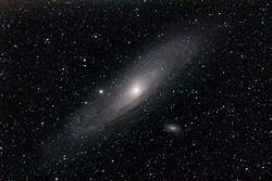 La galaxie andromède (M31) en forme de spirale est le plus lointain de tous les corps célestes à vision libre, avec une distance de 2,5 millions de km jusqu'au système solaire. Déjà Mauperthuis soupçonnait derrière l’objet en forme de brouillard, une île étoilée. Seulement Hubble a réussi a prouver grâce aux étoiles individuelles un objet aussi extragalactique. Comme d'autres galaxies, la Galaxie d’ Andromède abrite au centre un trou noir supermassif qui représente 230 millions de masses solaires. À partir de cette zone, après les premiers calculs de Schwarzschild, aucun signal n’émerge.