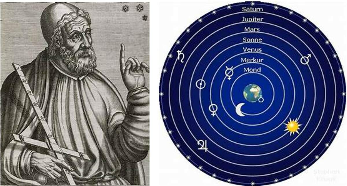 Der griechische Gelehrte Claudius Ptolemäus (1. Jh. n. Chr.) setzte in einem mathematisch ausgeklügelten Modell die Erde in die Mitte des Universums. Sein geozentrisches Weltbild war bis zur Erfindung des Teleskops im 17. Jh. und dem Siegeszug der Naturwissenschaften dem heliozentrischen überlegen.