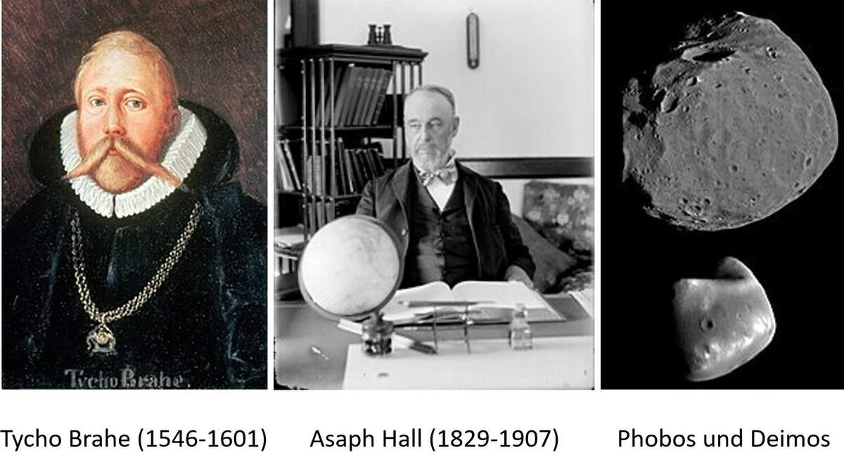 Mars befindet sich mit seinen beiden winzigen Monden Phobos und Deimos außerhalb der habitablen Zone, die Voraussetzung für höheres Leben ist. Bereits vor der Erfindung des Teleskops wurde die Marsbahn von Brahe genau vermessen. Beide Trabanten wurden 1877 von Hall entdeckt.
