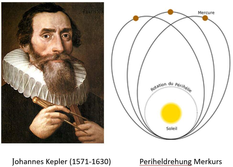 L'orbite de la planète la plus ensoleillée, Mercure, est une ellipse particulièrement prononcée, qui illustre la première loi de Kepler. Ce n’est que par Einstein qu’ il est possible d’ expliquer le fait que l’ ellipse tourne autour de son point le plus ensoleillé pendant une longue période en formant de cette manière une rosace.