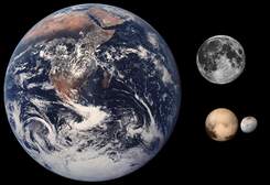 Pluto and its biggest moon, Charon, compared with the Earth and our moon