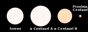 Unsere Nachbarsterne im Sternbild Kentaur - hier im Vergleich mit der Sonne - bilden ein Dreifachsystem.