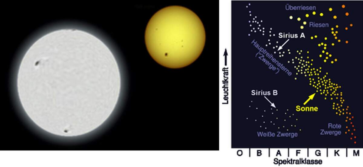 Hauptbild: Sirius A überstrahlt Sirius B (unteres Bildviertel links). Hier im linken Bild: Sirius A im Größenvergleich mit der Sonne. Rechtes Bild: Hertzsprung-Russel-Diagramm zur Leuchtkraft und Oberflächentemperatur von Sternen.
